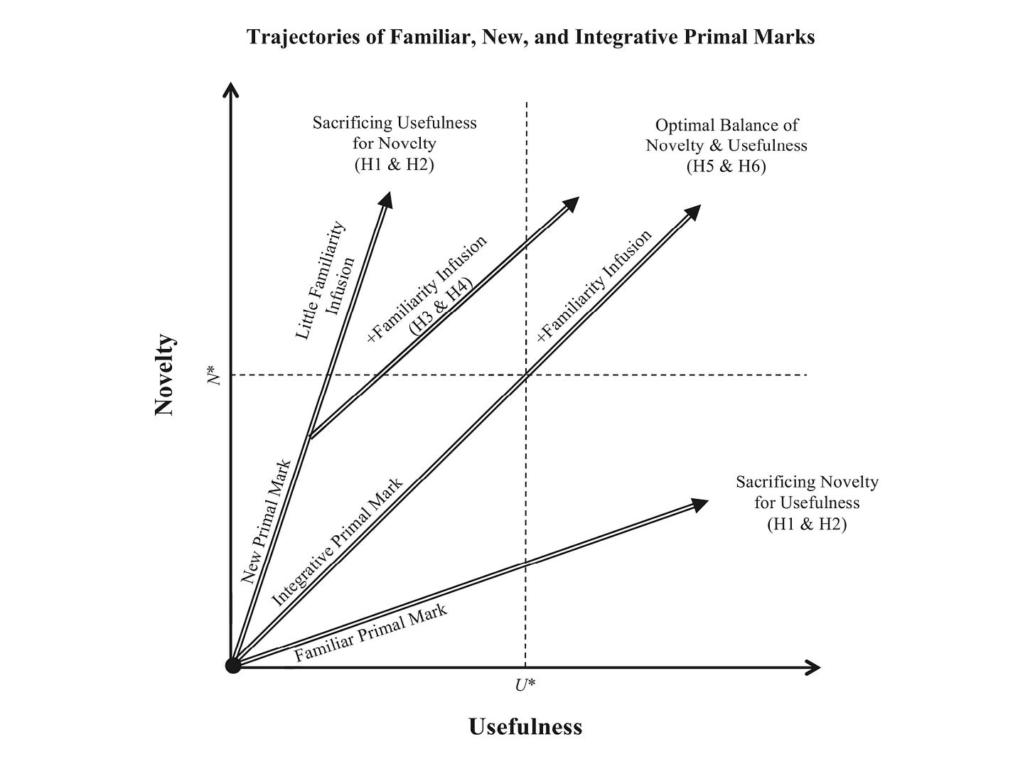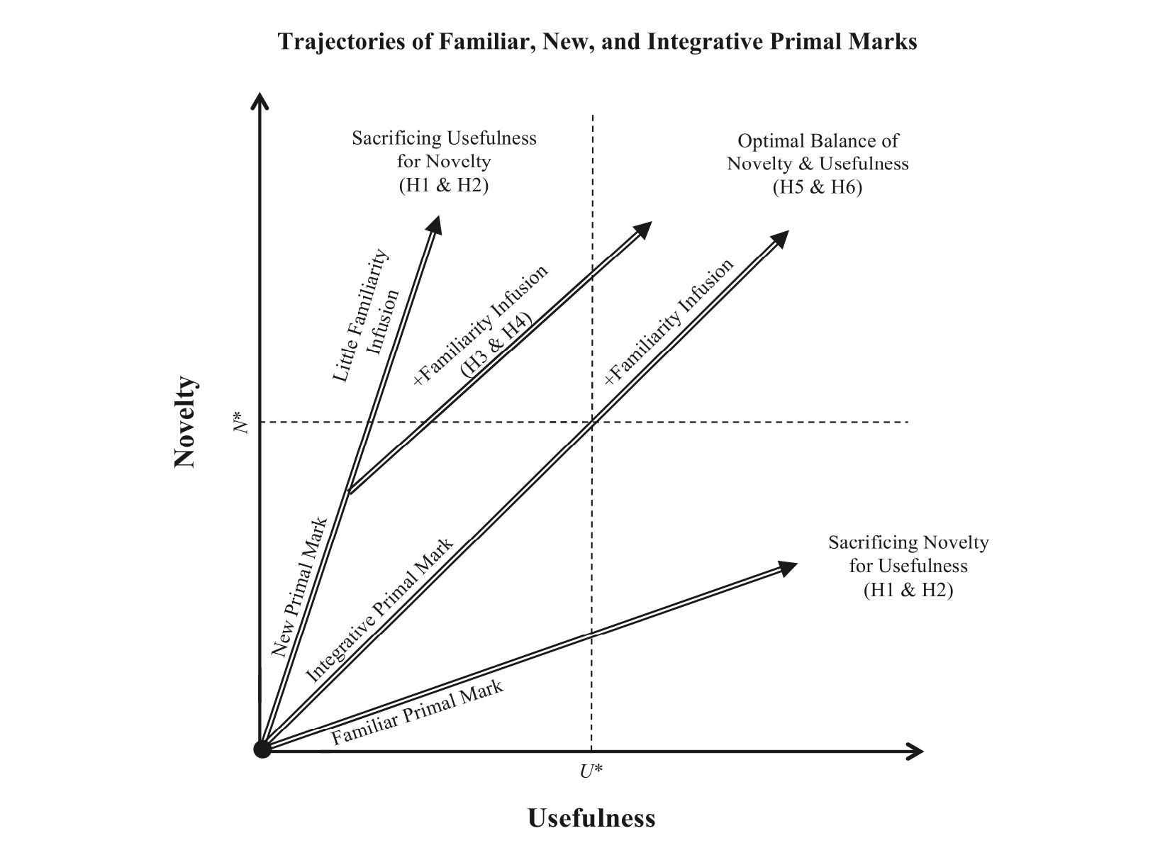 Berg's experiments revealed something remarkable about integrative primal marks. Not only did they produce ideas that were more novel than familiar starting points and more useful than purely new starting points — they actually optimized for both dimensions simultaneously.